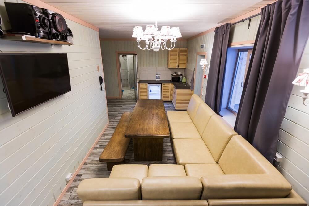 «Виктория» идеально подойдет для средних и больших компаний. Вас ждут русская парная с веником, бассейн, комфортные зоны отдыха внутри номера, полностью оборудованная и удобная кухня, а также просторная веранда с оборудованной мангальной зоной для жарки шашлыка.